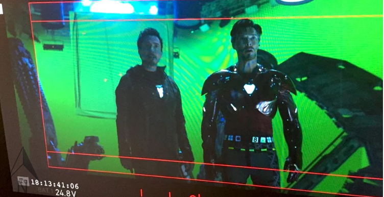 In an Avengers: Infinity War set photo, Doctor Strange (Benedict Cumberbatch) wears Iron Man armor alongside Tony Stark (Robert Downey Jr.).